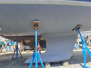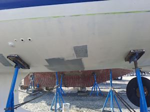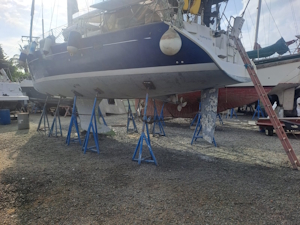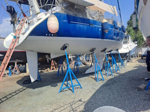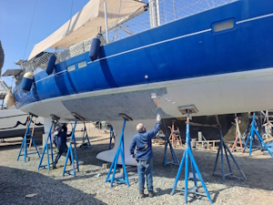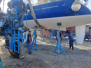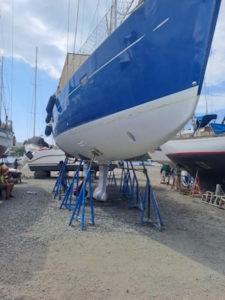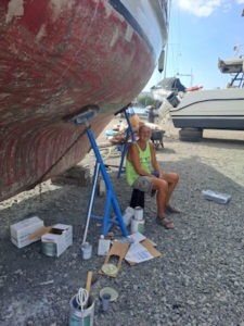 Vanmorgen heeft de bootlift ons weer opgetild, wat inhoudt dat we de verstaging aan de achterkant en het baby stag weer los moesten maken, de zonnepanelen die aan de zijkant hangen opklappen en het schaduwdoek los van de verstaging moeten maken. Nu kunnen ze de plekken onder de steunen voorzien van de eerste epoxy primer laag.