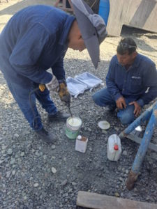 Vandaag hebben ze de onderkant van de boot afgespoeld, wat geen overbodige luxe is, want het is erg stoffig op de werf. De waterlijn wordt netjes afgeplakt voordat ze gaan beginnen met het aanbrengen van de eerste laag epoxy primer. Deze eerste laag is wit en de volgende laag is grijs, zodat je duidelijk kunt zien wat nog gedaan moet worden. De laatste laag is wederom wit. Fred blijft beneden om de mannen te helpen met het mengen en een beetje toezicht te houden op het proces.