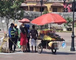 We zijn al een poosje op zoek naar een baseball knuppel, dit om ons te kunnen verdedigen aan boord tegen ongewenst bezoek. Een aantal maanden geleden hebben we via Amazon een aantal persoonlijke alarmen gekocht. Deze zijn klein, passen in je broekzak en maken een pokken herrie om iemand af te schrikken. In buurten waar het niet zo veilig oogt, geeft dit een wat meer geruststellend gevoel. We zien een mannetje zitten aan een tafel die een paar producten verkoopt zoals: zakmessen, petjes en artikelen ter zelfverdediging. Er ligt een taser en we vragen of dit legaal is in Colombia. Ja hoor, geen probleem en hij geeft meteen een demonstratie. We besluiten er één te kopen, deze zit keurig in een hoesje wat je aan je riem kunt bevestigen. Sommige mensen zullen zich afvragen waarom we dit soort maatregelen nemen. We komen soms in buurten waar het minder veilig is en ook aan boord kan het altijd gebeuren dat iemand ongevraagd aan boord wil komen. Je kunt je hier maar zo goed mogelijk op voorbereiden. Ik zeg altijd dat, wanneer je een paraplu meeneemt, het meestal niet gaat regenen.