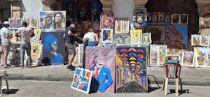 Er loopt een soort galerij onder de statige huizen, waar men kleurige kunst verkoopt die tot op de straat is uitgestald.