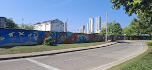 Voor de brug lopen we langs muren met mooie muurschilderingen.
